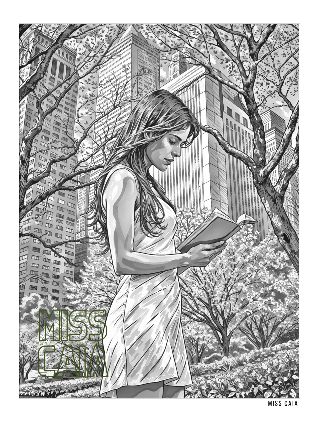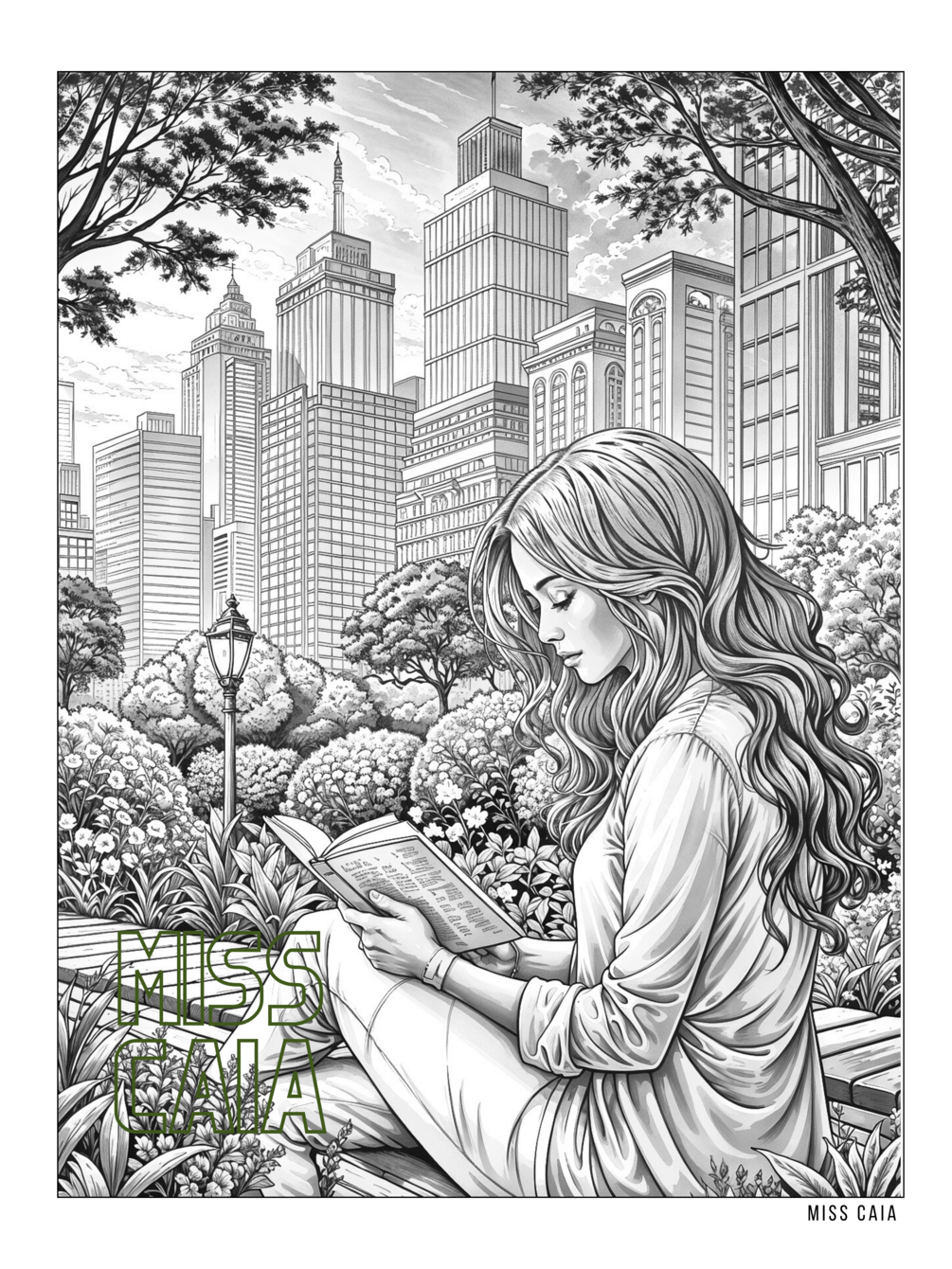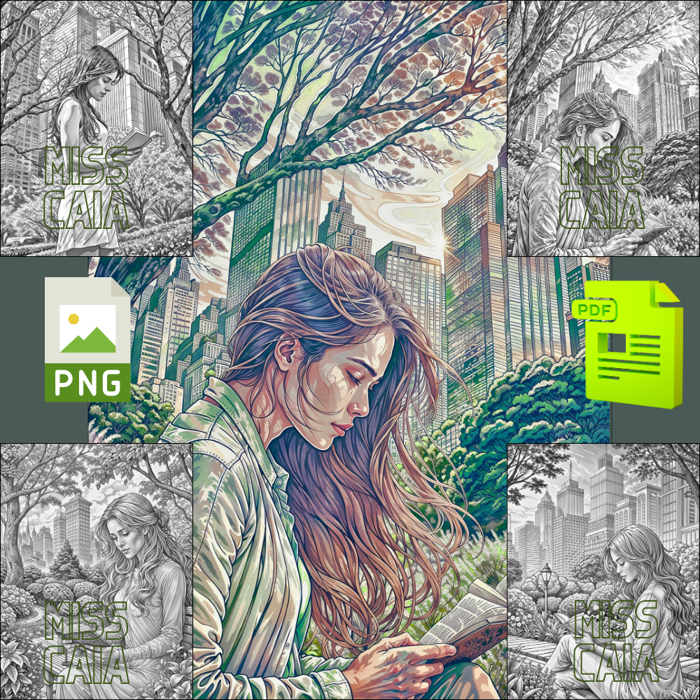 Spring in a City Park Reading Aesthetic Coloring Pages for Adults