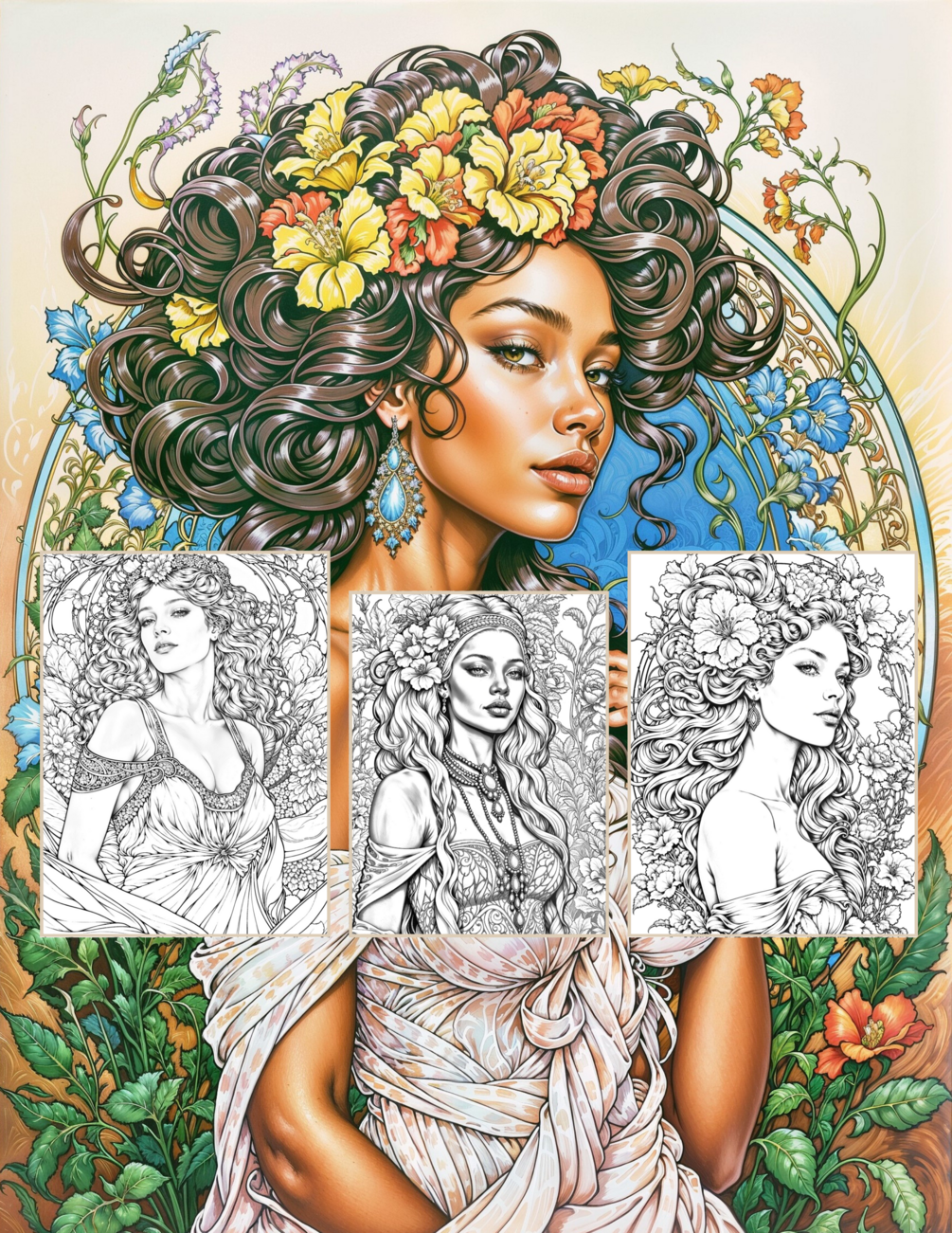 At the heart of this collection are thirty-five profiles of women, each adorned with elaborate hairstyles and attire reminiscent of the Art Nouveau era. Inspired by Alphonse Mucha's iconic series, these portraits capture the essence of naturalistic beauty and goddess-like allure. Every page invites you to discover the delicate interplay of lines and curves, the whimsical floral accompaniments that grace each image, and the meticulous attention to detail that defines the Art Nouveau aesthetic.