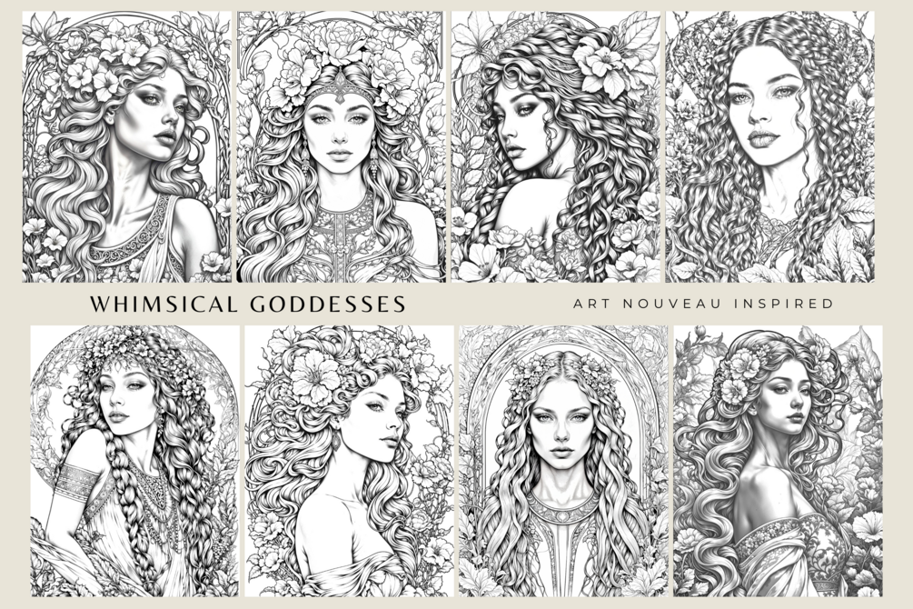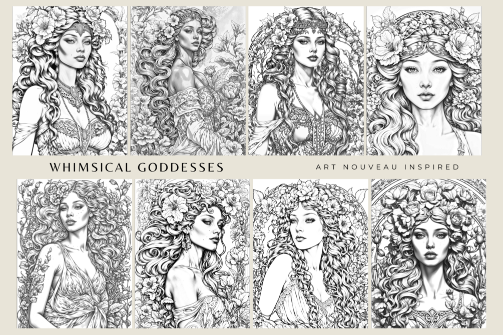 Whimsical Goddesses Art Nouveau Inspired Coloring Book for Adults & Teens 35 Coloring Pages Perfect for Relaxation or DIY Wall Art Projects